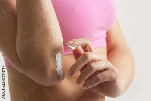 Woman applying elbow cream. Beauty and body care. Winterizing dry itchy skin on the elbow area.