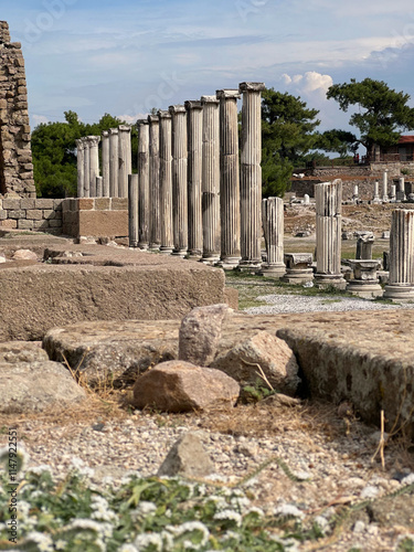 Ancient row of stone columns in archaeological site