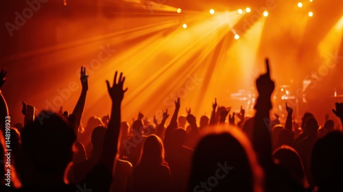 Crowd silhouettes at a concert with orange stage lighting.