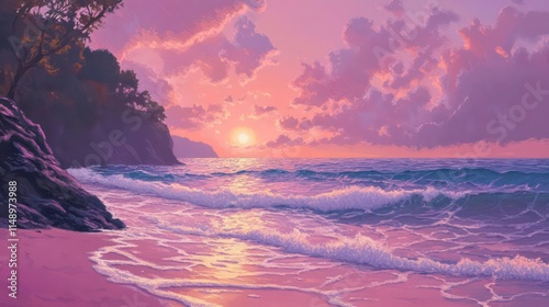 Serene sunset over a calm ocean beach with gentle waves lapping the shore.