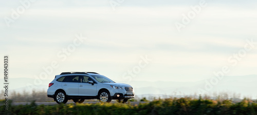 SUV car driving fast on intercity road at sunset. Highway traffic in evening