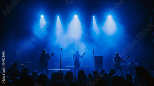 Energetic music performance with blue lighting and silhouettes of musicians.