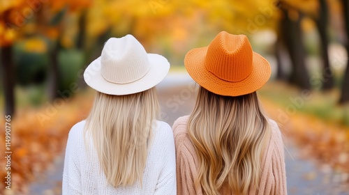 Dwie kobiety w kapeluszach spacerujące jesienią