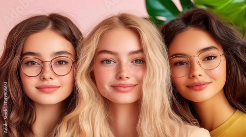 Trzy młode kobiety z uśmiechami na pastelowym tle