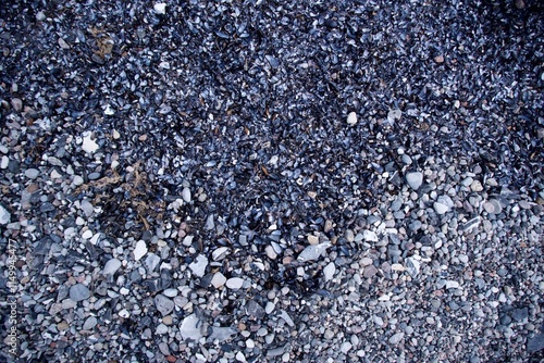 Draufsicht auf Kies und Muscheln, die einen strukturierten natürlichen Hintergrund in einer malerischen deutschen Umgebung schaffen