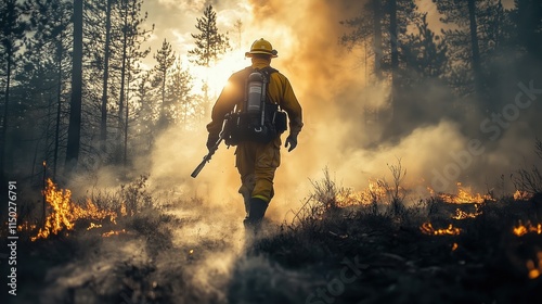 A forest ranger extinguishing a wildfire in a remote area, battling intense heat and smoke with specialized tools