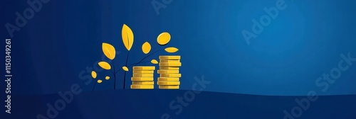 Stacks of coins with leaves symbolizing growth on a blue background.