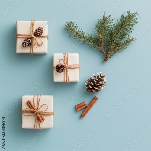 Decorative Holiday Gifts With Pine Cones and Cinnamon Sticks Arranged Attractively on a Light Blue Background in a Cozy Setting