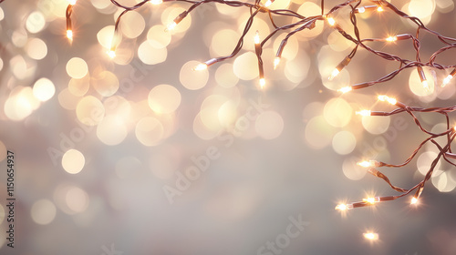Glowing dots of colorful festive lights hover in the foreground, their brilliance emphasized against a muted, blurred gradient background of earthy grays and browns. The macro pers