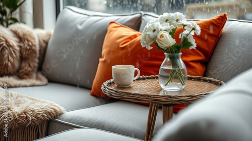 Przytulny salon z wazonem kwiatów i filiżanką kawy na wiklinowym stoliku