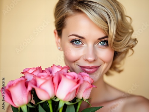 Radosna kobieta o krótkich blond włosach trzymająca świeży bukiet różowych róż, symbolizujących szczęście i piękno.