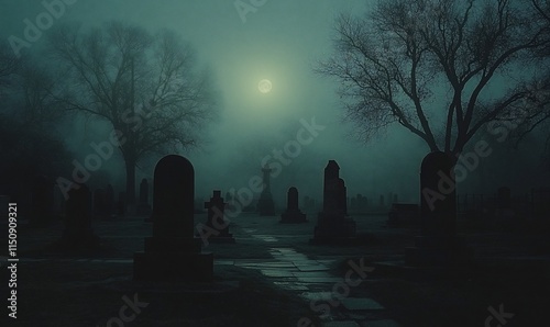 Spooky graveyard in fog at night with a full moon.