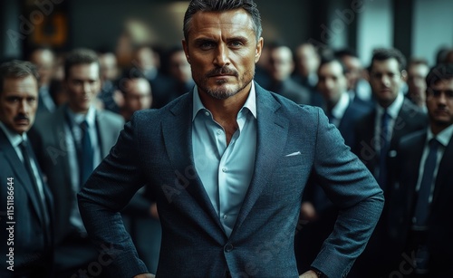 Confident leader stands at the forefront among a group of suited professionals in a corporate setting