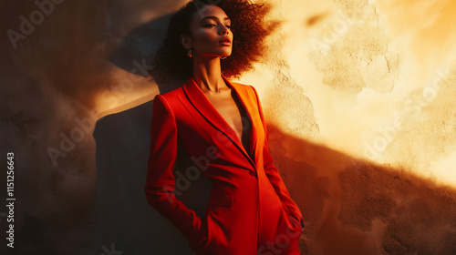 Stylowa kobieta w czerwonym garniturze na tle surowej, fakturowanej ściany, z ciepłym światłem dodającym atmosfery intymności i wyrafinowania.
