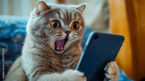 Surprised cat staring at smartphone with wide eyes and open mouth