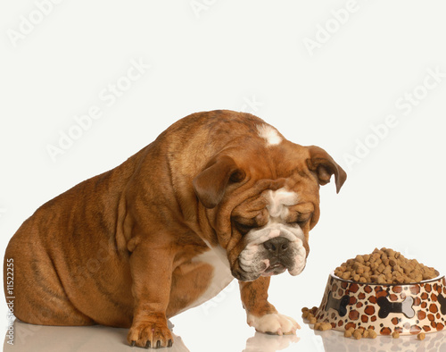 finicky or picky bulldog pouting beside full bowl of dog food