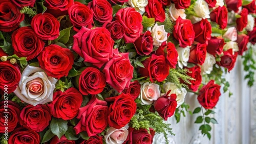 A majestic arrangement of vibrant red roses against a soft white floral wall, creating a stunning centerpiece for any room