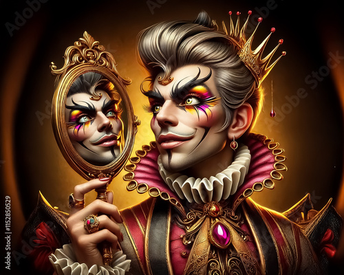A flashy, cunning character radiates narcissism. The character looks confidently into a luxurious mirror