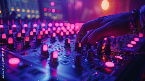 DJ's Hand Adjusting Knobs on a Vibrant Illuminated Mixing Console