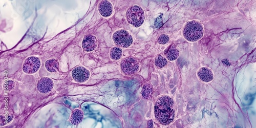 Microscopic image of a fungus infection in the lung, Hematoxylin and Eosin staining highlights the presence of fungal hyphae in the histology tissue block specimen.