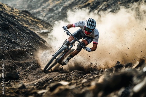 A dynamic shot of a cyclist racing down a mountain trail - dust and dirt kicking up behind the bike.