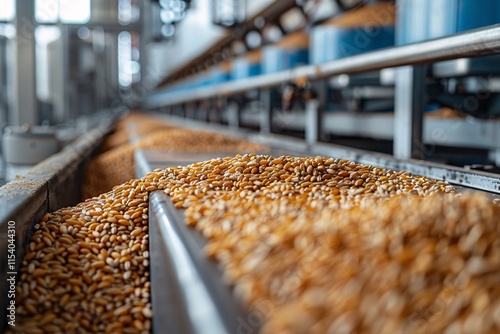 Golden wheat grains are flowing through a conveyor belt in a grain processing facility, highlighting the scale and efficiency of modern agriculture and grain handling.