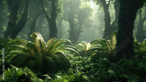 Lush green ostrich ferns thriving in a misty forest creating a serene and enchanting natural landscape in temperate regions