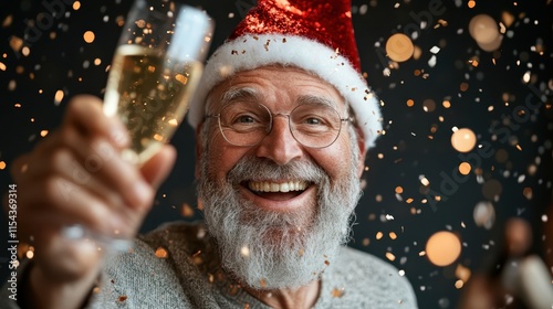 An elderly man wearing a Santa hat raises a glass amidst falling confetti, displaying joy and festivities, embodying the holiday spirit and jolliness galore.
