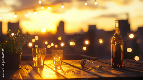 Warm golden light of sunset falls upon an intimate rooftop gathering setup, with empty glasses and bottles awaiting friends to toast to memorable moments together. Ironscape. Illustration
