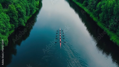 Aerial View of Rowers in a Boat on a Calm River Surrounded by Lush Green Trees