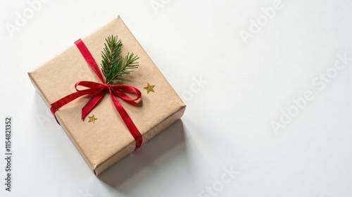 A thoughtfully wrapped gift box adorned with a sprig of evergreen and a vibrant red ribbon, resting on a pristine white surface