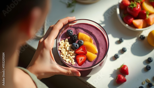 Woman preparing berry smoothie bowl on sunny kitchen counter