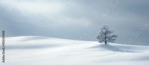Solitary tree in a serene winter landscape surrounded by soft, undisturbed snow under a moody overcast sky