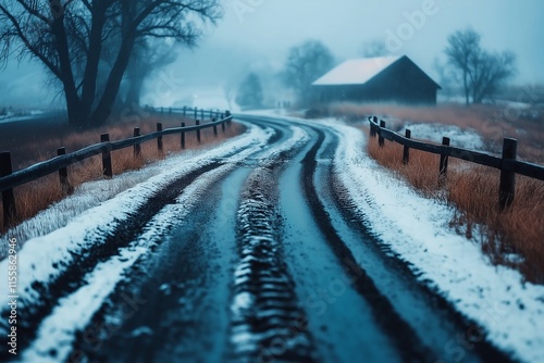 A winding road covered in slush on the road transitions from winter to spring, showcasing the thaw of melting snow in a tranquil landscape filled with mist.