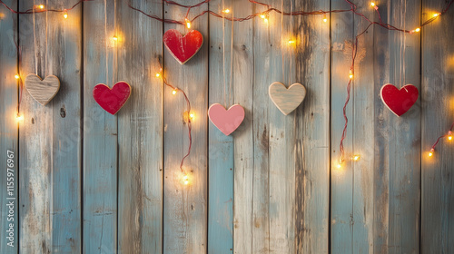 Drewniana powierzchnia z subtelnymi lampkami i serduszkami w kolorach czerwonym, białym i różowym, idealne na romantyczne okazje lub walentynki.