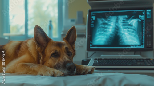 Współczesna klinika weterynaryjna z psem leżącym przed skomputeryzowanym rentgenem, ukazując profesjonalizm i troskę o zdrowie zwierząt.