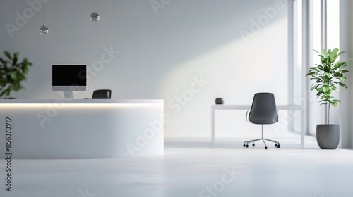 Modern Minimalist Office Reception: Clean lines and a minimalist aesthetic define this modern office reception area. Sunlight streams through large windows, illuminating a sleek white reception desk.
