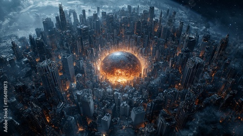 Catastrophic urban destruction futuristic city digital art space aerial view post-apocalyptic euphoria