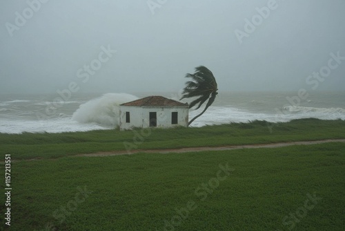 A coastal town battered by a hurricane, with palm trees bending in strong winds and waves crashing onto the shore