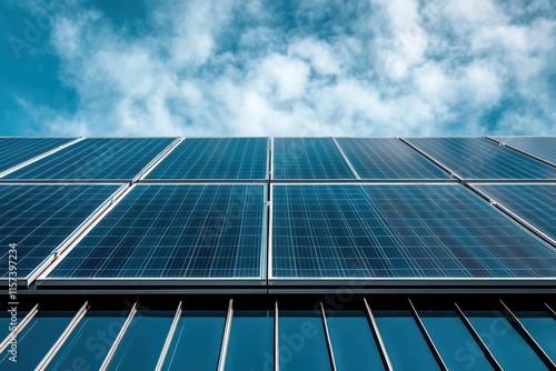 Solar panels installed on a tinted roof under a partially cloudy sky in a modern building