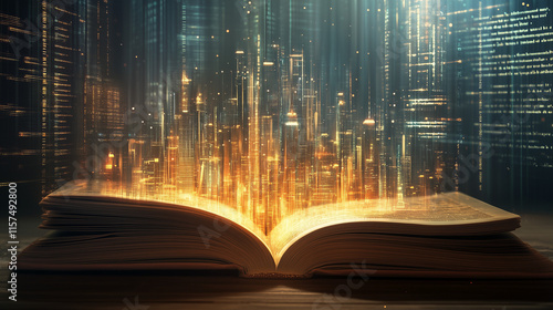 Cyfrowy krajobraz miejski unoszący się z otwartej książki, przedstawiający przełomowy potencjał wiedzy w połączeniu z technologią i nowoczesnym światem informacji.