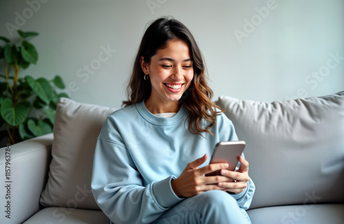 Happy young Hispanic woman uses smartphone at home. Smiling female teen scrolls social media shops online. Relaxed on comfy couch. Casual wear. Modern lifestyle. Digital services. E-commerce. Mobile