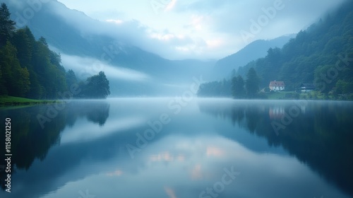 #1394780740Morning mist on the surface of a calm and clear lake, peaceful, mist