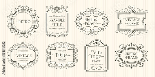 A collection of vector retro-inspired, ornate vintage frames in black on a cream background. Ideal for invitations, logos, packaging, and branding designs. Classic style, timeless appeal.