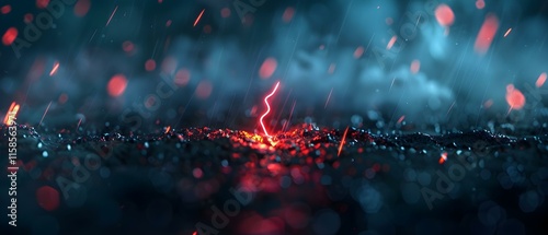Dramatic Lightning Strike in a Dark Stormy Environment with Vibrant Red and Blue Light Reflections on Wet Surface