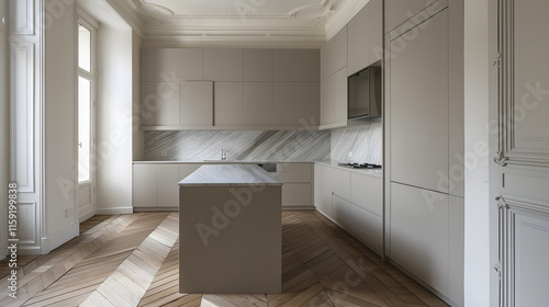 Cuisine épurée avec armoires grises, îlot central et murs en marbre.