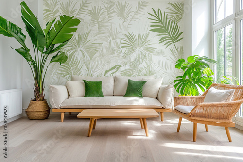 Modernes Wohnzimmer im Urban-Jungle-Stil mit tropischer Wandgestaltung