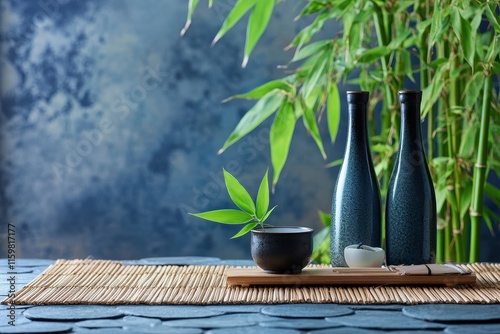Japanese rice wine served with bamboo leaves on the table