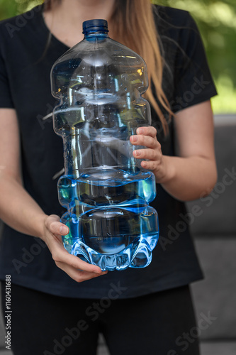 Drobna kobieta trzymająca dużą butle z zimną wodą pitną