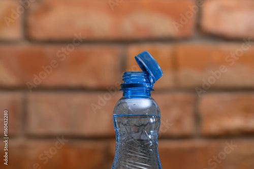 Plastikowy korek przyczepiony do butelki z wodą pitną